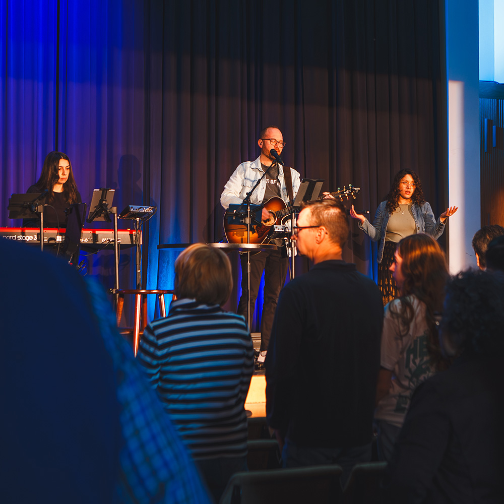 A brighter, more traditional setting with live worship and live preaching. Both services are at the same time and cover the same message. Select the space that feels best for you.